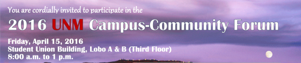 The 2016 UNM Campus-Community Forum is an opportunity for faculty, staff, students and community partners to interact with the University of New Mexico’s outreach and engagement community, share your work, and make connections with potential collaborators.