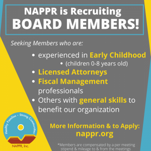 Through serving as a NAPPR, Inc. Board Member you will help the four-hundred plus families, child, and expectant mothers NAPPR currently serves as well as new families coming into the organization