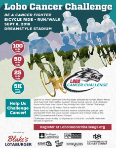 The Lobo Cancer Challenge raises money and awareness for patient care and cancer research in New Mexico. Riders, runners and walkers may choose the programs they wish to support.