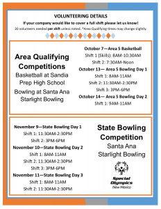 Special Olympics New Mexico is seeking volunteers to support at our Qualifying Basketball and Bowling Competitions in Albuquerque as well as our Albuquerque State Bowling Competition weekend this November. Volunteers will support in varying roles as needed, and no previous experience is required. Volunteer shifts range from 2-4 hours. Please email Rebecca at: [email protected] to register for a shift!